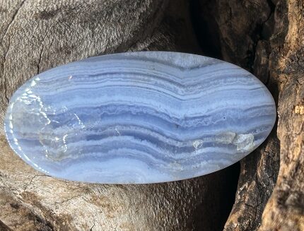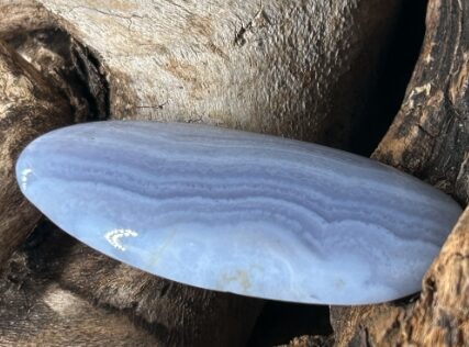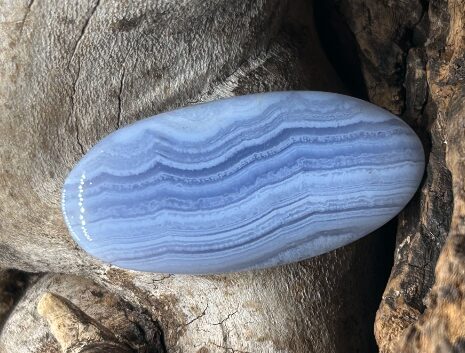 ce cabochon de calcédoine bleue – ou agate dentelle – présente des motifs délicats et une couleur bleu pastel réputée pour ses vibrations douces. pierre idéale pour favoriser la communication calme et l’expression personnelle.
