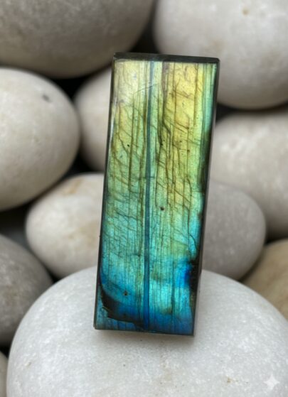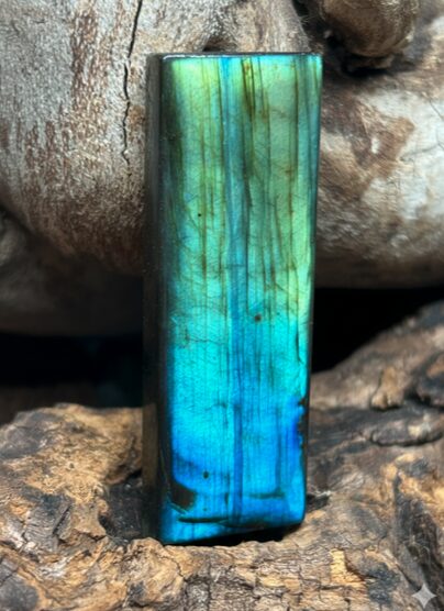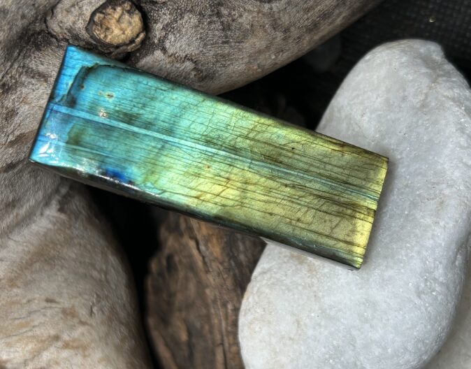 ce superbe cabochon de labradorite présente une irisation magnifique allant du bleu profond au vert et au jaune éclatant. il conviendra parfaitement à la création de bijoux énergétiques ou décoratifs.