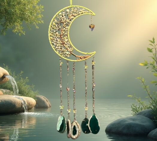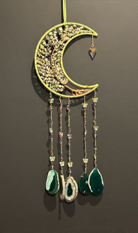 - matériaux : cuivre, jade verte naturelle, 5 tranches d’agate verte, perles attrape-soleil en cristal